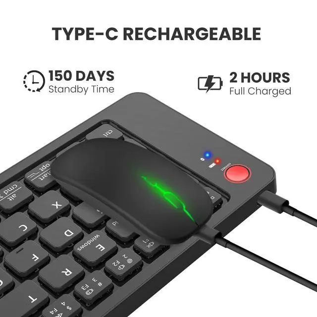 The mouse offers 3 adjustable DPI levels (1000-1600-2400) to cater to your individual needs, providing smooth, precise clicking and pointing on most surfaces. ^^ Rechargeable & Power SavingBulit-in rechargeable battery, both the travel keyboard and mouse can recharged via the included Type-C cable, fully charged within 2 hours. Additionally, an auto-sleep feature conserves battery when the folding keyboard mouse combo is not in use, allowing for an impressive 120 days of keyboard and mouse standby time.