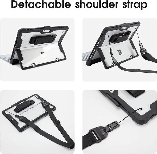 (PS: Screen ProtectorSurface Pencil & Keyboard are not included). ^^ with Hand Strap Located on the back of surface tablet case built-in a adjustable handle hand strap provides a more flexible and convenient way to use your tablet during work, study or journey, ideal for students, teachers, engineers, cashiers and waiters, etc. ^^ Adjustable and Removable Carrying StrapThe portable shoulder strap allows you to safely carry your iPad in landscape/portrait mode outdoors, or hang your iPad in the kitchen, bedroom, or car seat for kids to watch videos or use for entertainment. ^^ Clear Back Cover with pen holder The PC back is crystal clear to show the original color and personalized engraving of your surface tablet. Flexible to place and remove the pencil. This case prevent your pencil from lossing or breaking and you can use it whenever you want. ^^ Heavy Duty ProtectionMade of hard PC + silicone, this case features a 4-layer protective structure that provides full body protection against accidental drops, bumps and shocks. Precise cut and design allow easy access to all ports sensors speakers camera cut out and functions.