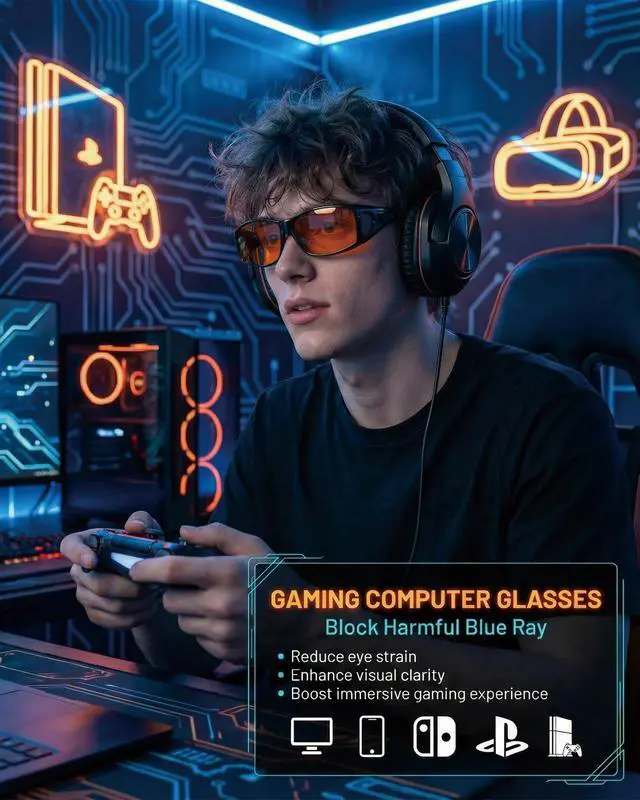 SUPERIOR COVERAGE & MIGRAINE DEFENSE: Engineered for sensitive eyes, OptiCraft fit-over design blocks 99-100% of blue light and filters specific migraine-triggering wavelengths (480-520nm) to significantly minimize tension headaches. Equipped with premium multi-layer coatings, these lenses feature Anti-Glare properties to reduce screen reflections. ENHANCE FOCUS & ELIMINATE EYE STRAIN: Stay immersed in long gaming sessions with a lightweight frame that fits over prescription glasses and pairs perfectly with headsets; by blocking UV400 and harmful blue light, these OptiCraft glasses prevent dry eyes and visual fatigue, keeping your vision comfortable. PRODUCT INFORMATION