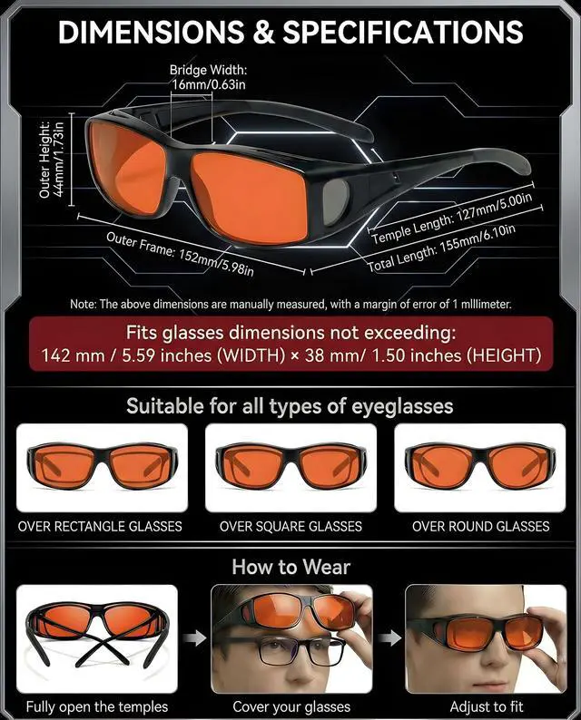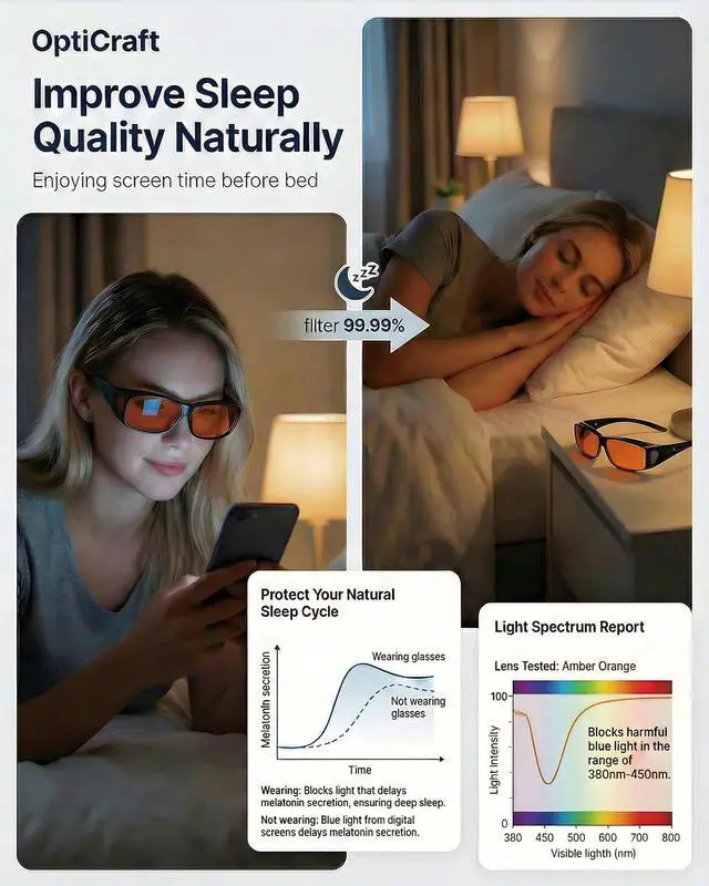 DescriptionERGONOMIC FIT-OVER DESIGN & PREMIUM BUILD: Specifically engineered to fit seamlessly over standard prescription eyewear, our OptiCraft glasses feature a wraparound structure with side shields for maximum peripheral protection. Constructed from premium PC material, the frames are sturdy and flexible yet incredibly lightweight to ensure compatibility with various temple arm thicknesses without adding bulk. OPTIMIZED FOR SLEEP & EVENING RELAXATION: By wearing them 2-3 hours before bed, you prevent blue light from suppressing melatonin production, effectively signaling your body it is time to rest so you can fall asleep faster and improve overall sleep quality.