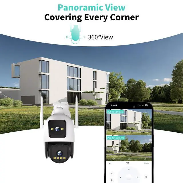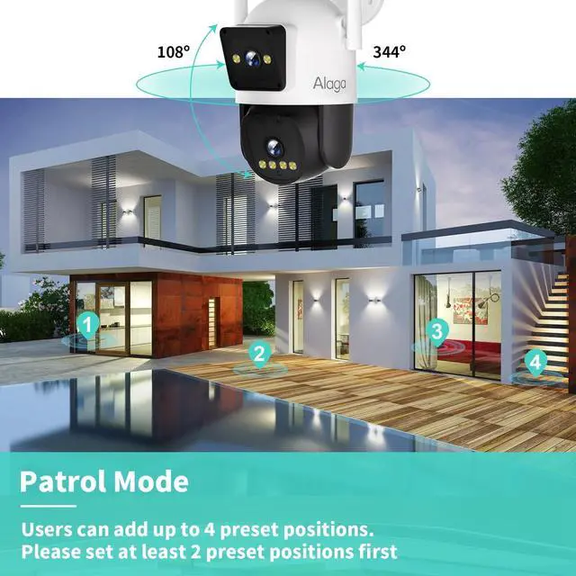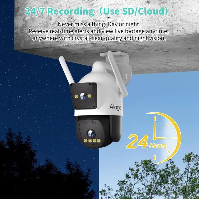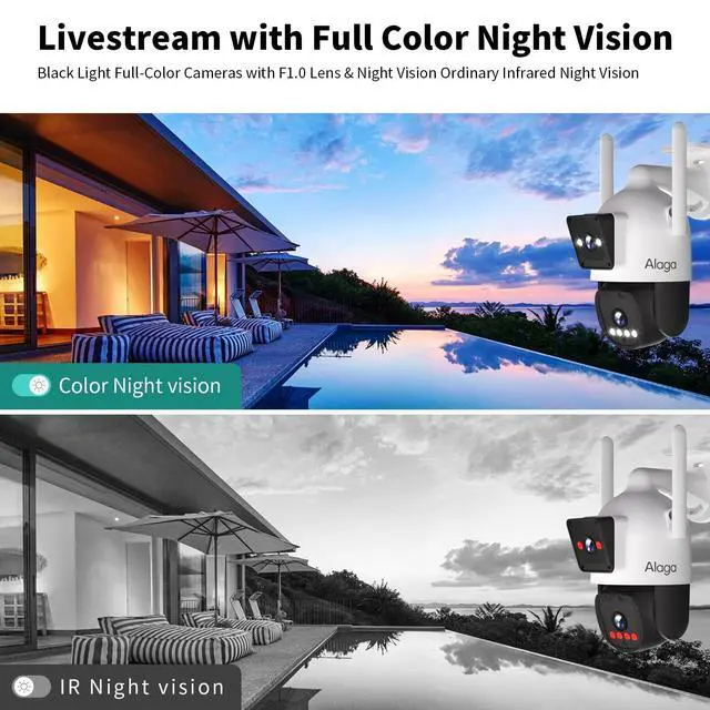 Vivid Night Vision with Dual 2MP F 1.0 Full-Color Lens Alaga Security Camera uses Black Light Full-Color technology for vibrant, true-to-life footage, even in ultra-low light. The F 1.0 lens ensures sharp, clear night vision without spotlighting, while the 360 pan-tilt-zoom (PTZ) design offers full coverage for day-and-night security. ^^