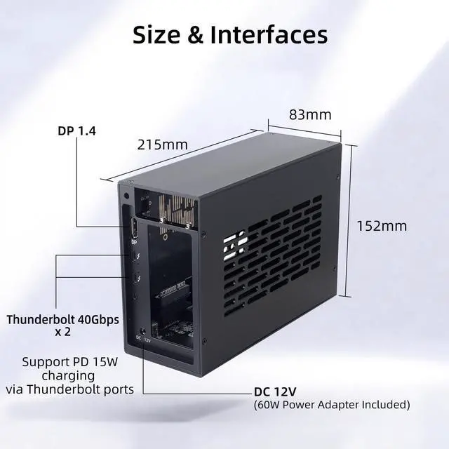 ^^ PSU and Ports: Includes powerful 60W PSU for stable operation. Each Thunderbolt output port provides 15W of Power Delivery (reverse charging) respectively. Additionally, there is one DisplayPort 1.4 output port. ^^