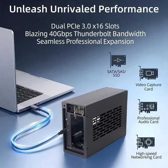 Expansion via Thunderbolt: Add 2 PCIe 3.0 x16 slots to your TB3/TB4/USB4 laptop or desktop (Mac/Win/Linux). This Thunderbolt PCIe expansion chassis enables external high-performance cards, unlocking pro potential without internal upgrades. ^^ 40Gbps