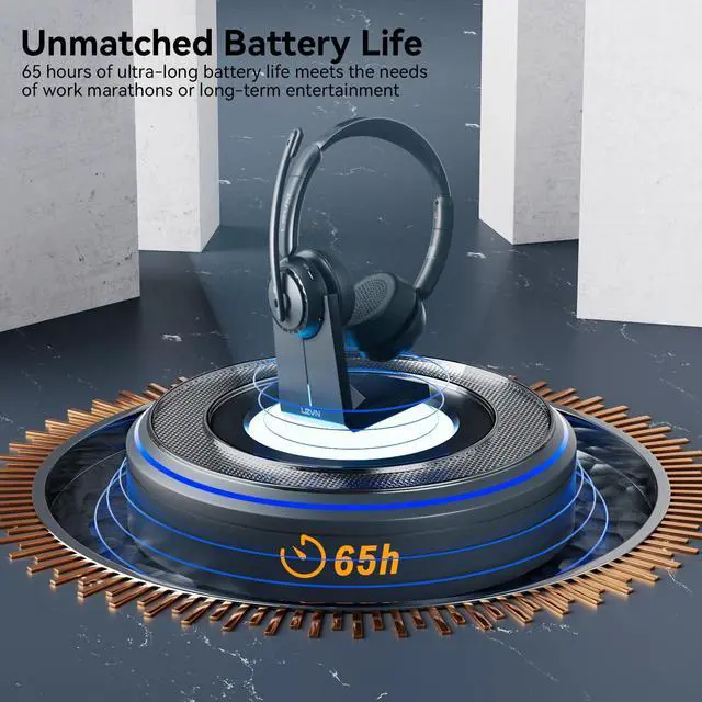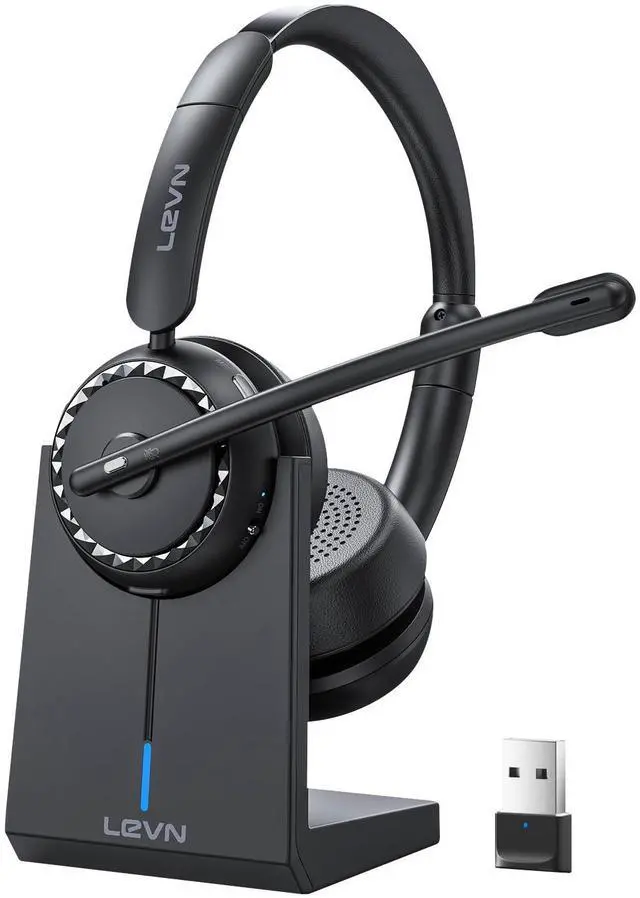 AI Noise Cancellation and Instant MuteEnter a world of unparalleled clarity with LEVN wireless headset - it can eliminates 99.9 % of background noise, ensuring your voice sounds clear and bright on every call. Whether you're in a bustling coffee shop or at a busy call center, callers can talk to you as seamlessly as if you were face-to-face, making it the choice for remote workers. With the added call privacy of the mute button, allowing you to easily manage calls, protect privacy. ^^ Multifunction Charging BaseThe charging base for this wireless headset with mic for work offers versatile charging options and includes storage for a USB dongle.