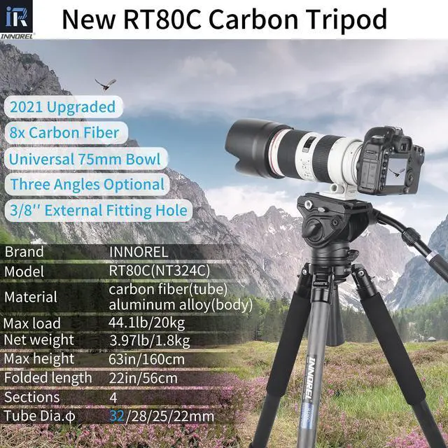 SUPER QUALITYIts max leg tube diameter is 32mm and minimum is 22mm, which is much larger than most tripods/monopods. Made of carbon fiber to maximize the legs strength to weight ratio of RT80C tripod, max load is up to 44lb/20kg. ^^ COMPACT&DURABLEDesigned to offer compact and lightweight camera support. Folded length is 22in/56cm and net weight is 3.97 lb/ 1.8 kg. The 4-section legs are held in place by twist locks and can be adjusted independently which let the RT80C can extend from a minimum height of 4.72 in/12cm up to 63in/160cm. ^^ PROFESSIONAL TECHNOLOGYAll the main parts (except tubes) of RT80C are made with CNC and Anodic Oxidation technology, which make the surface much better and smoother, the color of tripod more well-distributed and exquisite.