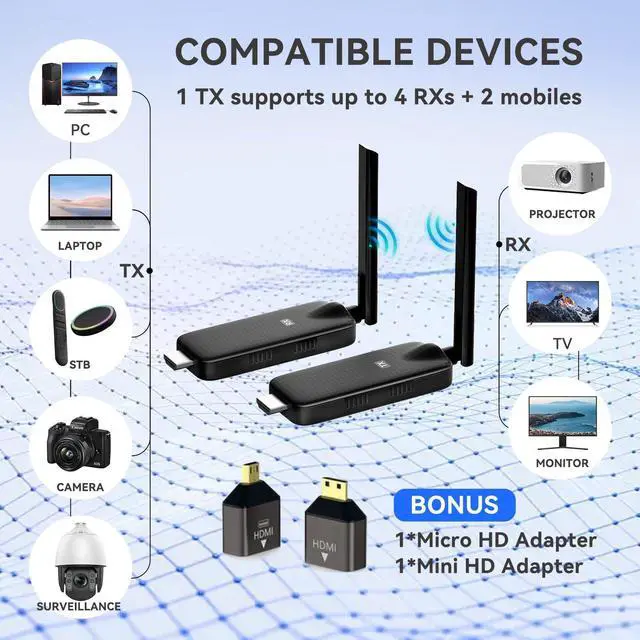 ^^ Versatile Applications: Perfect for business meetings, supervisory control, home theaters, multimedia education, gaming, live streaming, large conferences, outdoor movie nights, and professional presentations, etc. Whether indoors or outdoors, this wireless HD kit meets all your display needs. ^^ What's in the Box? 1 x Transmitter (TX), 4 x Receivers (RXs), 1 x Micro-HD Adapter, 1 x Mini-HD Adapter, 2 x USB Charging Cables, 1 x User Manual. Effortlessly enhance your display experience with this powerful, user-friendly wireless HD kit!