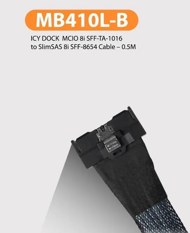 The MB310L-B is an Internal MCIO x8 (SFF-TA-1016) to SlimSAS 8i (SFF-8654) Cable to connect an HBA/RAID card/Motherboard or ICY DOCK NVMe enclosures
