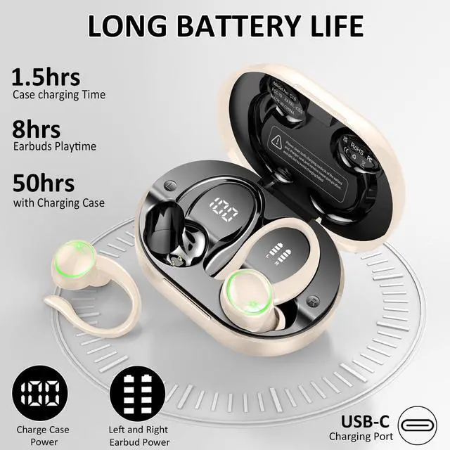 Charging Case: Bluetooth earbuds deliver up to 60 hours of total playtime with the charging case. Each earbud provides 8 hours of playback per charge, and the case can recharge the earbuds six times. A 10-minute fast charge via USB-C supplies an additional 2 hours of playtime. The earbuds are equipped with a dual LED digital display. During charging, the LED lights flash to indicate the charging progress, displaying the battery percentage from 1% to 100%. ^^ Ergonomic Sports Design and