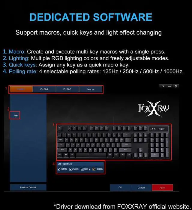 ^^ Dedicated Software: Supports macros, shortcuts, and RGB with 16.77 Million color-changing. The driver can be downloaded from FOXXRAY official website.