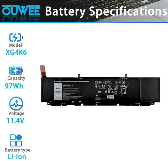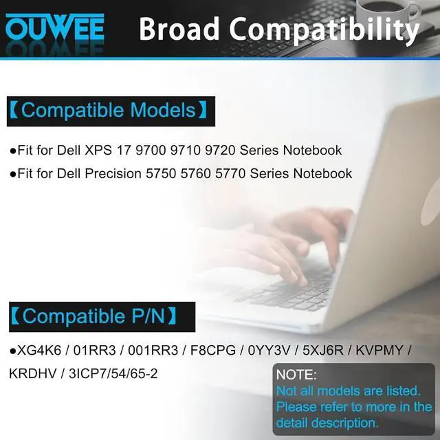 Condition: New; ^^ Replacement Battery Part NumbersXG4K6 001RR3 0F8CPG 01RR3 F8CPG OF8CPG 5XJ6R KVPMY 0YY3V KRDHV 3ICP7/54/65-2 ^^ Fully compatible and high stability Fit for Dell XPS 17 9700 17-9700-D1741S 17-9700-D1761TS 17-9700-D2961TS 17-9700-R1505S 17-9700-R1868TS 17-9700-D2968TS 17-9700-R1845S 17-9700-D1968TS 17-9700-D1961TS 17-9700-R1861TS 17-9700-R1745S 17-9700-D1868S Series Fit for Dell XPS 17 9710 9720 9730 Series; Fit for Dell Precision 5750 5760 5770 Series; Fit for Dell P92F P92F001 P92F002 P92F003 Series. ^^ OUWEE Perfect After-saleRest assured with 30 days money-back and 12 months Warranty; 24 x 7 email support. Any questions you can contact with us via "Your Orders" tab in account. We are committed to resolving any situation in which our product does not meet your expectations. ^^ Safe to UseAll OUWEE products are Certified by UL / CE / FCC / RoHS for safety. Strict guidelines for compatibility, strict quality control standards to ensure the true capacity, stable current and low self-discharge and standards compliance for environment safety. We are confident in the performance of the replacement battery. ^^ AdviceIn the event that the new battery fails to be recognized upon initial installation, kindly reinstall it and verify whether the interface is fully connected.