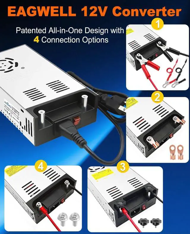 Specifically optimized for tough startups: For resistive loads, ensure your device power is within 85% of the 360W rating; for high-torque motors, the peak power handles over 2x the motor's running power to prevent startup failures ^^ Patent-One-Click InstallationBuilt-In Wires & Battery Clips (US Patent) Stop struggling with loose wires! Our integrated design features a built-in ON/OFF switch for safe, instant power control and unique "+" and "-" rods that allow you to clamp battery clips directly onto the unit. This Eagwell patented design (US Patent) eliminates the guesswork, providing a secure, professional connection for jump-starting or testing 12V devices in seconds ^^ Truly Plug-and-PlayComplete DIY Kit with Dual Wiring Options No hidden purchases or extra trips to the hardware store. This all-inclusive kit comes with a UL-listed power cord, pre-crimped wire lugs, metal clips, mounting screws, and terminal clamps. Whether you prefer a permanent direct-wire installation for your RV or the convenience of clamp-style connections for workshop projects, everything you need is in the box for a hassle-free setup ^^ Intelligent Cooling SystemDust-Proof, Noise-Free, & Built to Last Say goodbye to overheating and noisy fans. The rugged aluminum alloy shell is paired with integrated heat-dissipation channels and a dust-proof fan net.