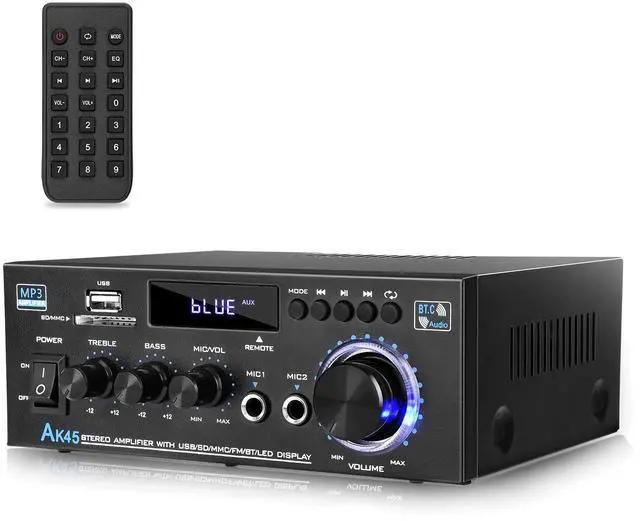 (NOTE: Remove battery insulating sheet on remote upon receipt for it to work, Remote control can ONLY remotely control the volume of MP3/BT/FM. ) Set the desired output of music with bass and treble control knobs. Enjoy a clear and detailed display with our amp that comes with a built-in digital LED display. ^^ [Wide Application]The AK45 audio amplifier compatible with mobile phones, computers, tablets, notebooks, and projectors with AV audio etc. Recommend for home TV audio, computer audio system-game, tower Speaker, garden speaker. Small simple compact design also for car audio system.