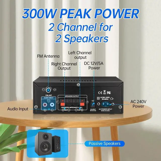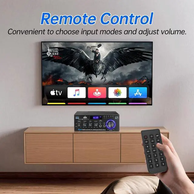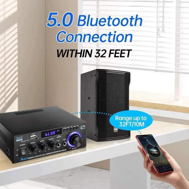 (Note: Please keep the distance within 16.4 ft/5m between the device and amplifier without any wall blocking. If you are connecting with PC devices, please keep the distance within 6.5 ft/2m. ) ^^ [Hi-Fi Amplifier] Designed for those seeking high-fidelity sound quality, this amplifier features 2 enhanced audio processing chips and powerful sound processing technology for low distortion output and high-fidelity sound quality. Treble, bass, and Mic volume can be adjusted according to personal preference. The equalizer optimizes the sound for better output through a speaker. ^^ [Easy Operation]Conveniently change audio settings from a distance with the included mini remote control.