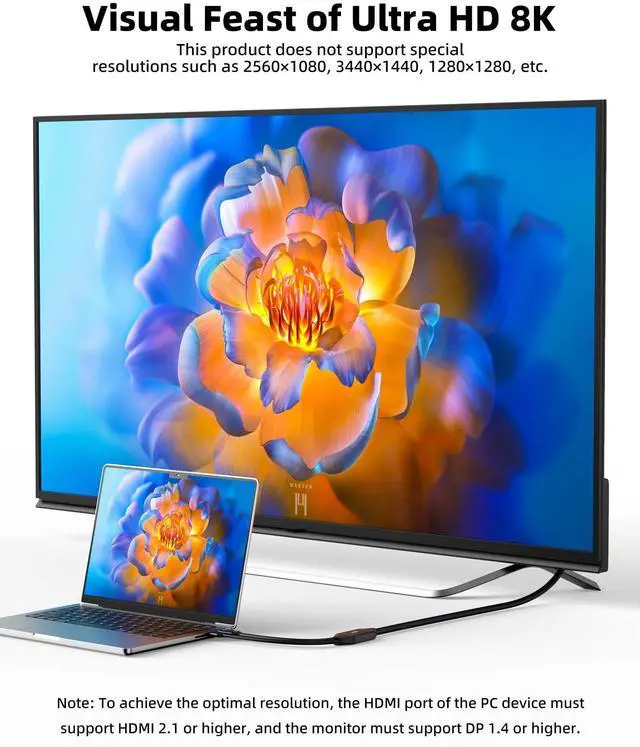 ^^ 8K@30Hz High Resolution: The HDMI 2.1 to DisplayPort 1.4 cable supports a maximum resolution of 8K@30Hz and is compatible with 4K@120Hz. Achieving 8K resolution is only possible when both your HDMI device and monitor support 8K. In some cases, you may need to set the refresh rate and resolution through the graphics card control panel (such as Nvidia or AMD control panel).