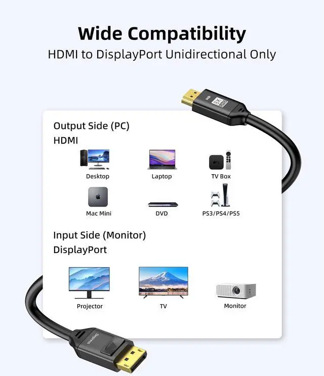 One-way Transmission: This HDMI to DisplayPort 144Hz cable supports signal transmission from HDMI devices to DisplayPort devices only and does not support bidirectional transmission.
