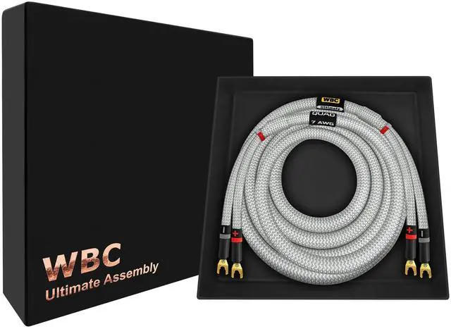 The high-end packaging, makes these a great gift for any Audiophile or Music Lover who will appreciate handcrafted, high quality audio cabling. The braided Tweed cloth jacket and embroidered labeling will compliment your high-end gear quite tastefully; this is truly The Ultimate speaker cable. ^^ At WBC we only use the highest-grade connectors for these audiophile cable assemblies. Eminence 3 micron, 24K Gold plated, audiophile-grade, multi-spade connectors, (compatible with 8mm and 6mm binding posts), provide superior abrasion & corrosion resistance and unrivalled performance. The spade plugs are specially reinforced to support heavy gauge cables (thicker profile).