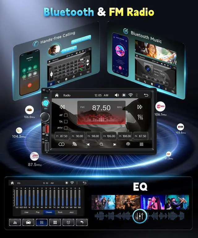 Bluetooth & FM & EQ: Double din radio is equipped with built-in Bluetooth, enables hands-free callings. The EQ sound effect function allows precise adjustment of audio for superior sound quality. Plus, the FM radio function feature grants access to a wide range of radio stations, allowing you to listen to radio stations, listening news, enhancing your driving experience on the road ^^