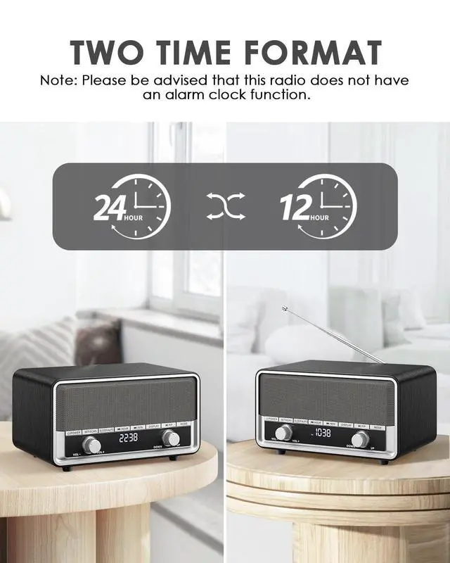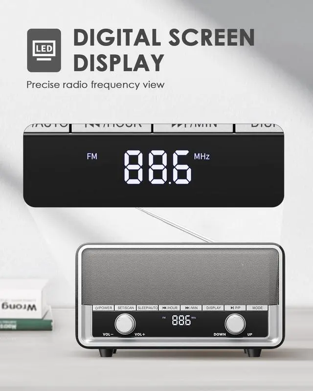 LED Display: Clock radio is equipped with an LED display, ensuring that you can clearly view the time and radio channels in any lighting conditions. In addition, the radio's sleep mode allows you to set a timer to shut down, creating a peaceful sleeping environment for you. But the clock radio does not have an alarm function. ^^ Retro