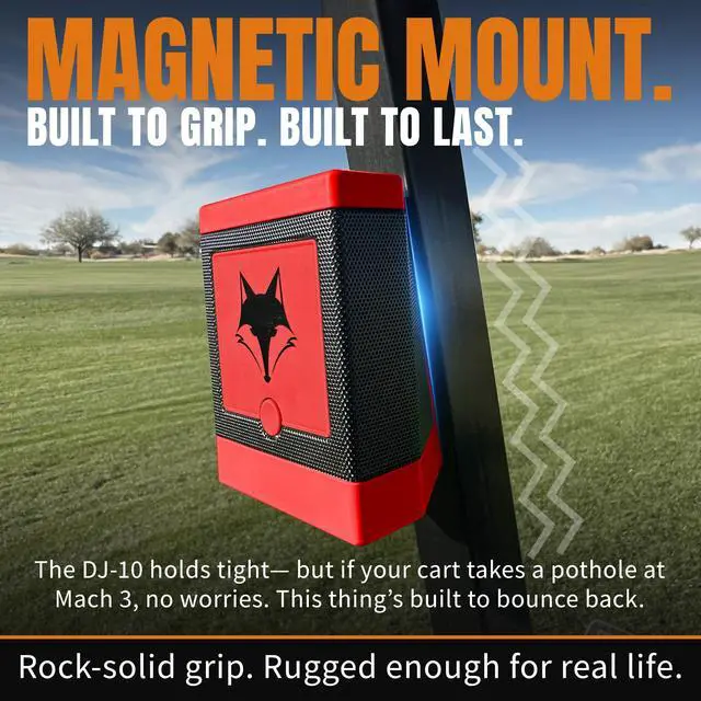 GOLF + MUSIC = A BETTER ROUND A golf cart Bluetooth speaker with premium sound that actually lets you hear your playlist over your buddys terrible swing advice. Crisp, clear, and loudbecause weak speakers and bad drives have no place on the course. ^^ MAGNETIC MOUNT LOCKS IN, STAYS PUT The Desert Fox DJ-10 wireless golf speaker secures instantly to your cart frame with strong magnets. No slipping, no bouncing, just rock-solid placement for uninterrupted music every round. ^^ RETRO KNOB, BUILT-IN CHARGING, ALL-DAY BATTERY Adjust volume as smoothly as your putting stroke (or at least smoother than your last shot).