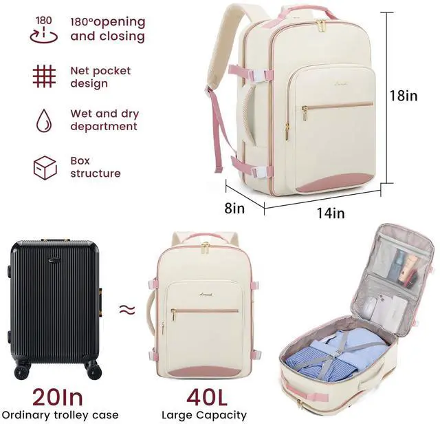 PRACTICAL BOX STRUCTURE DESIGN The carry-on backpack can be expanded 180 with a box structure, more convenient for you to pack things up. The dedicated electronic product compartment on the back can be used to store your electronics, which can be quickly taken out when going through the security check. ^^ 40L LARGE CAPACITYOur travel backpacks enable you to pack all your travel essentials for a 3-5 day travel, which can hold 3-5 days' clothing, a pair of shoes, your wallets, toiletries, a 17.3 '' laptop, a 12.9 '' iPad and so on.