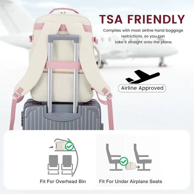 • BACKPACK FOR TRAVELING ON AIRPLANESWith an 18*14*8 inches size, this travel backpack meets the standard of personal item bags of airlines. It can be put on the luggage set and under the seat easily. The luggage strap on the back of the backpack allows it to be stably attached to a suitcase.