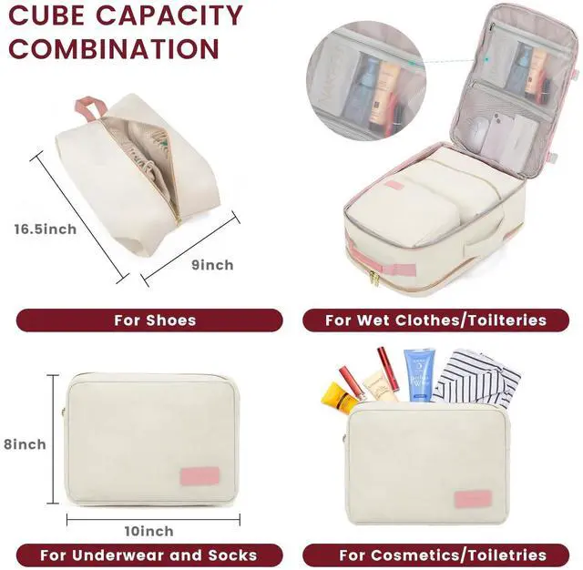 The side straps can also help you compress the pack when it is too full. ^^ BACKPACK FOR TRAVELING ON AIRPLANESWith an 18*14*8 inches size, this travel backpack meets the standard of personal item bags of airlines. It can be put on the luggage set and under the seat easily. The luggage strap on the back of the backpack allows it to be stably attached to a suitcase. ^^ WELL-DESIGNED COMPARTMENTSThis travel backpack has 4 main compartments and 3 packing cubes supplied, which enable you to keep your things in order. Your shoes, toiletries, and underwear can be placed in separate packing cubes.