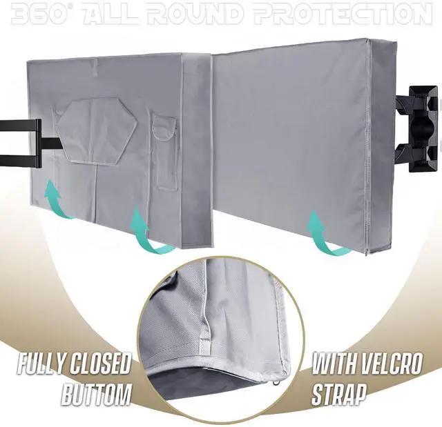 ^^ 360 PROTECTION: Full cover with bottom sealed with hook-and-loop straps. Ensure the strong firm stick of the outdoor TV cover. 2 transparent films on both corners interior that have a good fixation effect to prevent the cover from falling off. Give your television a perfect full protection.