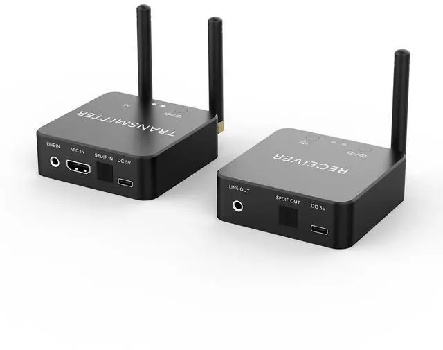 5.8GH z& 5.2GH z Dual-band Wireless Stereo Audio Transmitter and Receiver Compared to the traditional 2.4GHZ, 5.8GH z& 5.2GH z Dual-band has a larger bandwidth, better stability and less interference. It fundamentally solves the situation of channel congestion and dropped lines. ^^ Multiple Flexible Connection, Better CompatibilityWireless transmitter receiver set with HDMI/Optical Digital (SPDIF) /RCA( 3.5 mm) input and output can easily connect with your TV, DVD, MP4 to transfer audio wirelessly to a powered speaker, subwoofer, amplifiers, home theater, stereo and so on. At the same time, it is also equipped with AUX IN port and 3.5 mm headphone port, perfect for various appliances in the family.