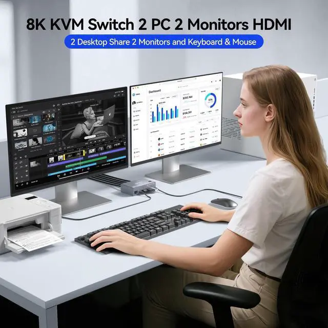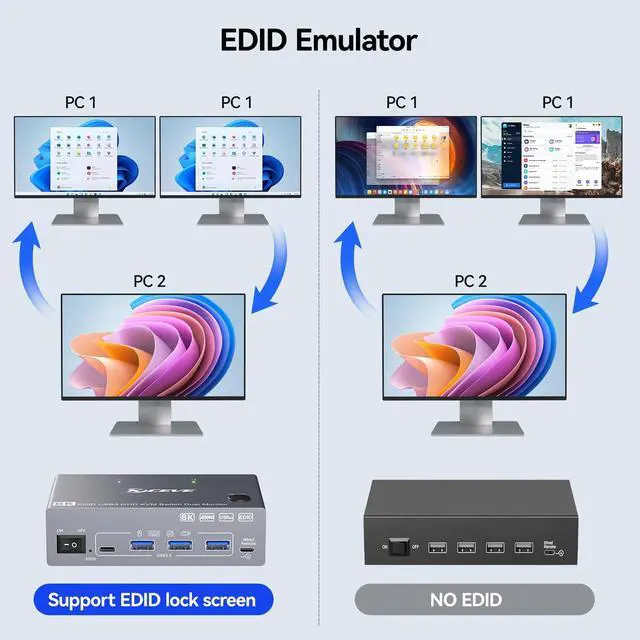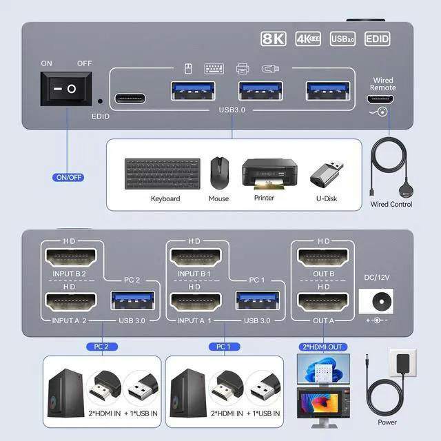 USB 3.0 KVM Switch 2 Monitors 2 computers HDMI with EDID & 8K@60Hz KCEVE dual monitor KVM switch allows you to control 2 computers with one set of keyboard, mouse, and 2 monitors. Featuring EDID emulation, it automatically stores display settings to prevent window mess when switching. KVM switch 2 computers 2 monitors support stunning 8K@60Hz, 4K@144Hz, 4K@60Hz, and lower resolutions for ultra-clear visuals. ^^ 8K KVM Switch Dual Monitor with 4 USB 3.0 Ports & 5Gbps Speed Share 2 monitors and 4 USB 3.0 devices (including USB-A and USB-C) between 2 PCs without unplugging.