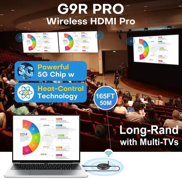 • 165FT/50M with Multiple TVs165FT/50M Long-Transmission Range in open areas with Wireless HDMI to Multiple TVs, and 50FT/15M Through Walls (Avoid Thick Walls or Large Obstacles). G9R PRO delivers stable performance and reliable connectivity. Perfect for large rooms, conference halls, or home entertainment setups with multip