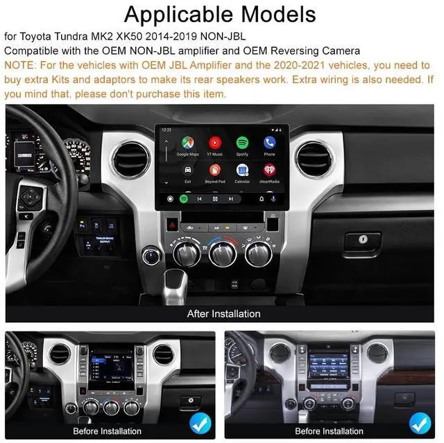 &: Powered by an Octa-Core ARM processor and 4GB RAM, this upgrade ensures lightning-fast performance and smooth operation. The 64GB ROM allows for seamless multitasking, eliminating lag and slowdowns during media streaming, navigation, or Bluetooth usage. Perfect for 2016 Toyota Tundra Radio replacement, providing a performance-driven upgrade. ^^ - & -.: Stay connected wherever you go with built-in 4G LTE, ensuring uninterrupted streaming, browsing, and communication. With dual Wi-Fi bands ( 2.4GH z & 5.0GH z), enjoy seamless internet connectivity, while Bluetooth 5.0 allows for hands-free calls, music streaming, and instant wireless connection, providing crystal-clear audio for all your in-car entertainment needs ^^, &: Maintain steering wheel controls and AC display while enjoying richer DSP sound. The waterproof HD backup camera ensures safe reversing in your Toyota Tundra 2014 radio, day or night ^^ & Stay connected wherever you go with Google Maps offline navigation, so you can access routes even when your signal drops. Perfect for off-road adventures or countryside drives, the system supports precise GPS tracking in every terrain. Plus, night mode ensures comfortable, glare-free viewing after darkideal for travelers, campers, and everyday explorers alike.