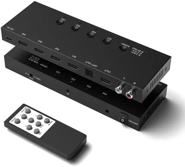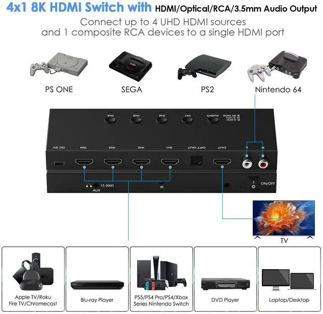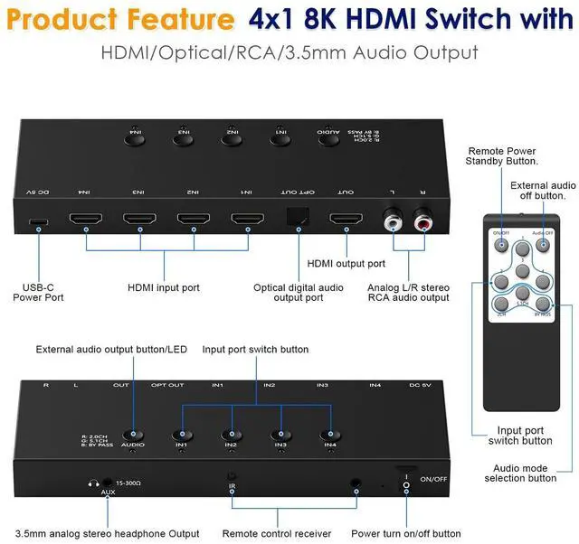True 8K@60Hz HDMI 2.1 Visual Performance Experience ultra-high-definition video with support for 8K@60Hz ( 4:4: 4, 8-bit) and 4K@120Hz, delivering zero-lag, uncompressed visuals with HDR10 and Dolby Vision. Perfect for next-gen gaming on PS5, Xbox Series X, and high-end streaming. ^^ 4-in-1 HDMI Input with Multiple Audio Extraction Connect up to 4 HDMI devices simultaneously. Extract and output audio via Optical digital audio (S/PDIF), Analog L/R stereo RCA output, or 3.5 mm headphone jack. Includes an External Audio Output Button with LED for easy on/off control. Supports DTS-HD, Dolby TrueHD, and LPCM 7.1 for immersive sound.