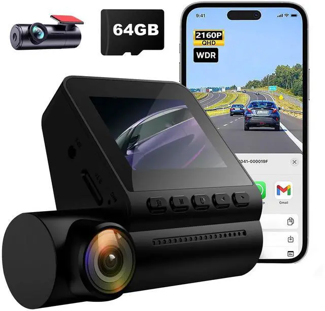 Dual-Camera Front and Rear 4K/1080P Dash cam, Ultra-Clear Night Vision, Loop Recording, Parking Surveillance, 24-Hour Recording, with GPS, and Mobile Phone connectivity with 64GB SD Card