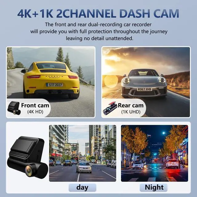 • Dual-camera 4K front and 1K rear dash camOur front and rear dash cam can simultaneously record Ultra HD 4K front video + FHD 1080P rear video, which can help you read key details such as road signs and license plates more clearly, bringing you better driving pleasure and higher safety, helping you to present evidence during accidents such as collisions.
