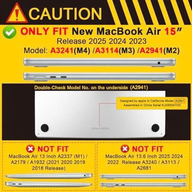 • Case Only Compatible for New MacBook Air 15.3-inch (diagonal) 2026 2025 2024 2023 release with M5/M4/M3/M2 Chip Model number:A3448/A3241/A3114/A2941. NOTE: Please check the model number "Axxxx" on the back of your laptop before purchase to ensure a perfect fit.