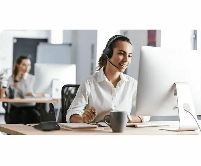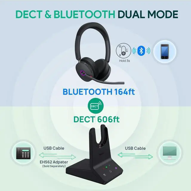 DECT & BT Dual-Mode: Revolutionize your workflow with dual-mode wireless headphones, supporting simultaneous connection to 3- devices(PC/desk phone/mobile). Enjoy ultra-long 606ft wireless range, secure encrypted calls, and robust interference resistance in dense office. ^^ Total Control, Pro