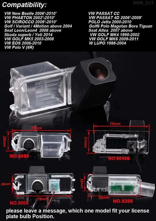 Dear customer, Please must check the camera size and appearance before place an order, see if can fit your car license plate lamp place size and appearance! Because the same car model in different countries may have some difference, please check the camera size and compare the installation of your car carefully to avoid mistake. This product could fit for all below models as expected: Replacement for Porsche911 Cabriolet 996 991/ 911 Targa 991/ Boxster Spyder Cayman 987 981 / 718 Boxster 981 982 / Cayenne 92A / Panamera 970 / Macan 95B 1997/09-2016/09; Replacement for Seat Altea XL 5P1 5P5 5P8 / Exeo 3R2 ST 3R5 / Ibiza III 3 6L1 / Ibiza IV 4 Sportcoupe 6J5 6P1 / Leon 1P1 5F 5F1 / Leon SC 5F5 / Leon ST 5F8 / Toledo IV KG3 2006/04-2023/12; Replacement for SkodaSuperb II Kombi 3T4 3T5 2009/03-2015/05;