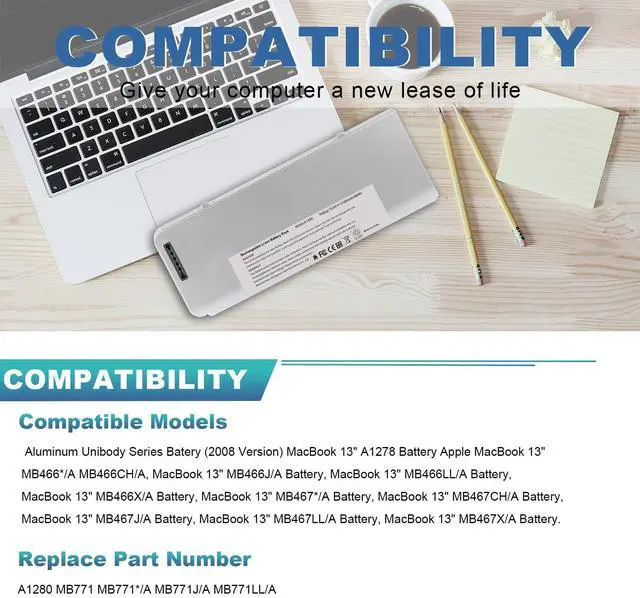 Battery life: Up to 500 recharge cycles over the life of the battery. ^^ Compatible Part NumberA1280 MB771G/A MB467LL/A MB466LL/A. ^^ Compatible the Modelsfor MacBook 13" A1278 Battery, MacBook 13" MB466*/A Battery, MB466CH/A Battery, MB466J/A Battery, MB466LL/A Battery, MB466X/A Battery, MB467*/A Battery, MB467CH/A Battery, MB467J/A Battery, MB467LL/A Battery, MB467X/A Battery. ^^ Quality Assurance100% new from manufacturer, every battery has passed factory testing, grade A cells ensure fast charges and low power consumption, built-in circuit protection ensures both safety and stability, guarantee your piece of mind while using the battery or storing it. ^^ Perfect Customer Service24 x 7 email support. Your satisfaction is extremely important to us. If you have any doubts, please click on seller store on right corner ask a question and contact us directly, professional and friendly customer service will be provied for you.