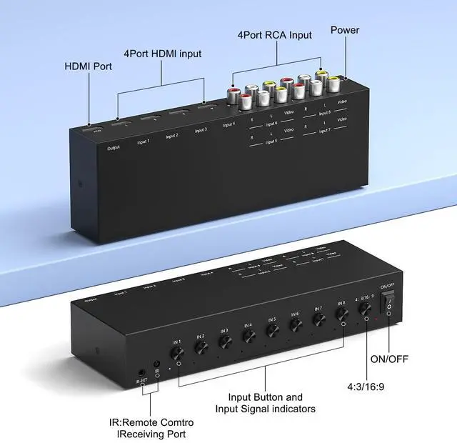 / 4:4: 4. All HDMI ports support HDR/3D/CEC. AdvantagesMechanical design, simple push-button switching, metal enclosure, excellent stability and longevityEasy installation and operation, no software drive neededNOTES1. Please connect the power cableincluded) with 5V power source to make the unit work. 2. It can not convert HDMI to RCA. CautionIf you have any use problems, please contact the seller's customer service, we will provide you with the most satisfactory after-sales service. Package1* 8 Input 1 Output HDMI/ AV Converter/ Switcher1* USB Type C Power Cable1* USB Power Adapter1* IR Remote