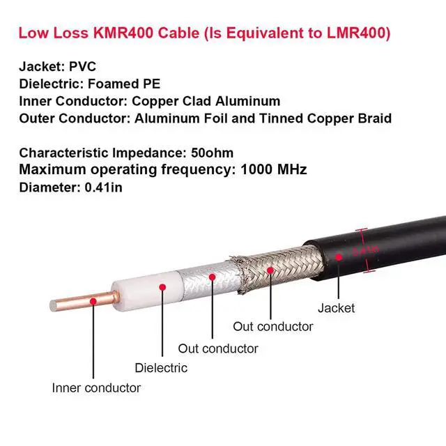 Ultra-Low Loss The inner conductor of this lmr400 coaxial cable pl259 cable is copper clad aluminium, 0.41 inches in diameter. A larger cable means a much larger center conductor and supports better signal retention than RG58 Type coax or 240 Type coax. ^^ Durable Solidly Built This cb coax cable is with the copper clad aluminium conductor. Flexible UV proof rf-pvc jacket, designed for 20-year outdoor exposure in harsh environments. ^^ pl-259 Clamp Connector In the uhf antennas cable we use pl-259 mount clamp connector, not the easy came off crimp type.