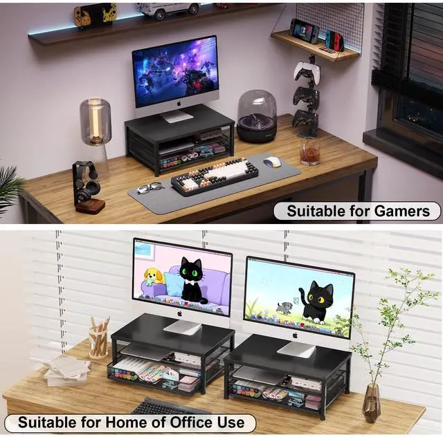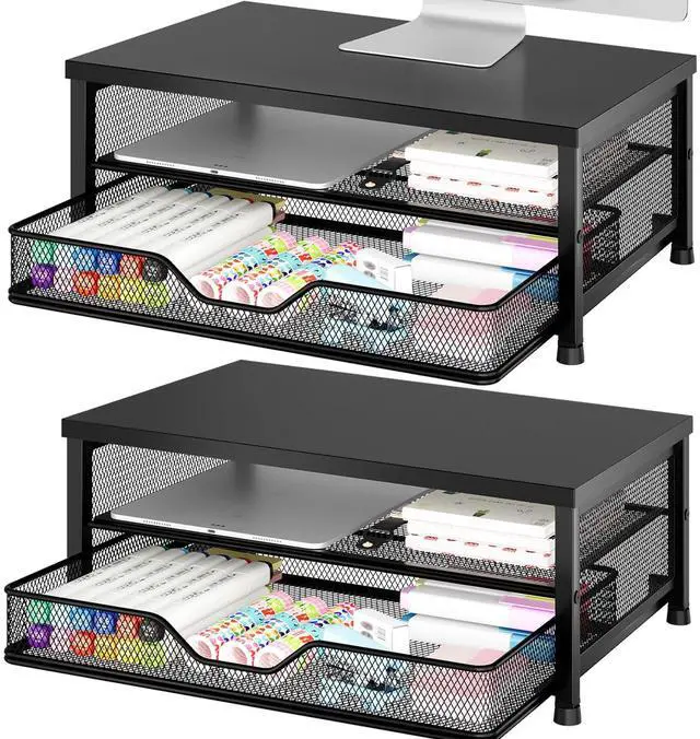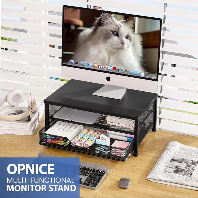 Ergonomic ComfortOPNICE monitor stand elevates your screen to an ideal eye level, effectively reducing neck and shoulder strain. Whether you're working, studying, or gaming, it keeps you comfortable and focused for long periods of time ^^ Maximize Desk SpaceThe 2-Tier desk organizer with drawer provides more than 70% extra storage space, easily organizing files, office supplies and desk accessories. Keep your desktop neat and tidy, enhance your sense of well-being and enjoy a productive and clutter-free work environment ^^ Sturdy & ReliableThe monitor stand is completely made of high quality metal, sturdy and durable, not easy to shake.