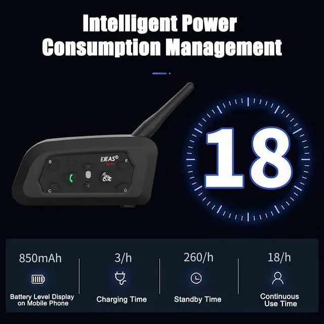 2-Person Intercom System Real-Time CommunicationStay connected with your partner while on the move. This helmet intercom supports 2-person real-time communication with clear, instant audio perfect for motorbike riders, referees, and skiing partners. ^^ Clear & Stable Audio PerformanceThe headset delivers crystal-clear, low-latency sound thanks to noise-reduction technology. Experience stable communication and rich sound quality, even at high speeds or noisy environments. ^^ Long Battery Life for Extended Use850mAh battery, 260 hours standby time, 18 hours continuous use time. The helmet intercom provides long-lasting battery endurance for day-long trips or full sports events without interruption.