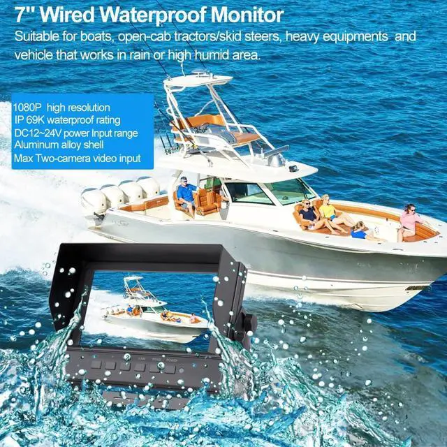 APPLICATIONSAHD 1080P wired two-camera system, waterproof camera and wateproor monitor. For its high vibration resisance ability of 10G and wide power input range DC12-24V, it is suitable for boats, open cab vehicle, buses, box trucks, pickup trucks, garbage trucks, flatbed trucks, dump trucks, street sweeper trucks, refrigerator trucks, motor homes, vans, skid steers, farm tractors, combines, cotton pickers, crop sprayers, bulldozers, snow plows, forklifts, excavators, heavy equipments, etc. ^^ WATERPROOF MONITOR7 color monitor with U-type metal bracket, metal housing, 1080P resolution.