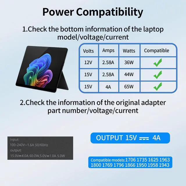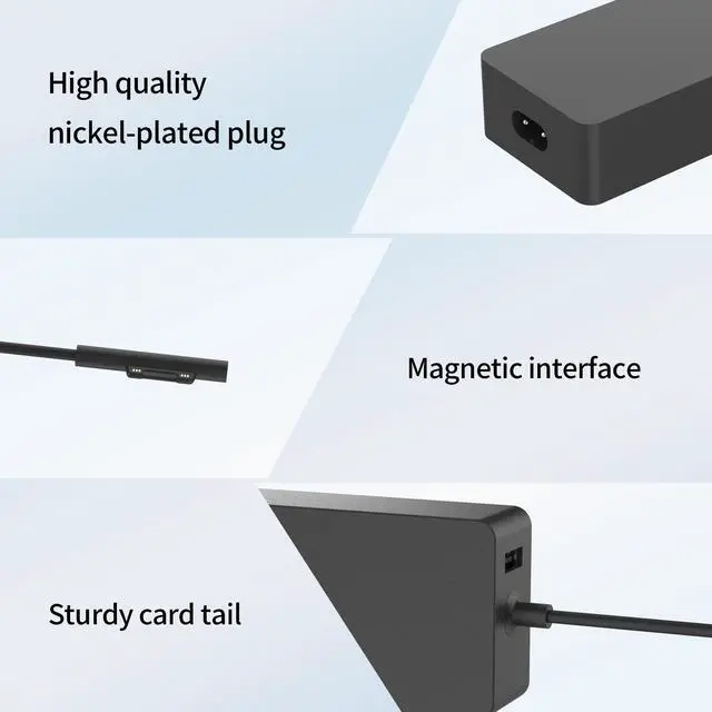 Please note: maximum power is 65W. Not suitable for chargers above 65W. Additional 5V 1A USB port, which allows you to charge your phone and other devices simultaneously. It works with Microsoft 15V- 2.58A 44W and 12V- 2.58A 36W ^^ Compatible with Microsoft Surface Pro 9 Surface Pro 8 Surface Pro 7+ Surface Pro 7 Surface Pro 6 Surface Pro 5 Surface Pro 4 Surface Pro 3 Surface Pro X Surface Laptop 5 Surface Laptop 4 Surface Laptop 3 Surface Laptop 2 Surface Laptop, Surface Go 1 2 3, Surface Pro 2017 Laptop AC Adapter Power Supply Cord ^^ Compatible with model 1706 1800 1631 1724 1866 1868 1876 1824 1873 1983 1943 1950 1958 1963 1625 1796 1769 1735 and so on. higher charging performance than 44W, 39W, 36W, 24W laptop / tablet charger ^^ Dependable
