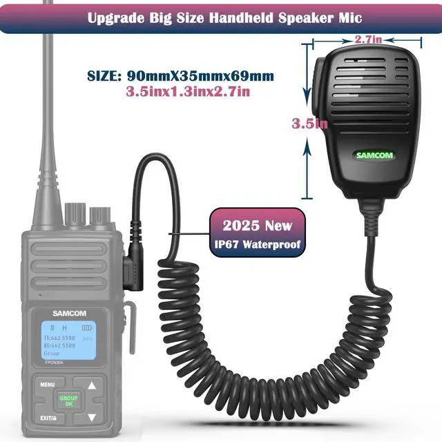 SAMCOM SCSP05 New Version 2 Pin shoulder mic more pick up voice more clearly for smooth talk with more than sensitive 1303 dB ^^ IP67 Waterproof - With the IP67 professional waterproof, this remote hand/shoulder mic can withstand even the toughest environments, you can always rely on it to keep you connected ^^ 2 Pin K Head - Two-pin standard diameter 2.5 mm and 3.5 mm, space of two-pin 11mm, work well with SAMCOM FPCN10A/FPCN30A/FWCN30A and compatible with Baofeng UV-5G Plus, UV-5R, 5RM, GT-5R PRO, UV-21R walkie talkies, and UV-25M and Kenwood TH-D75A radios, and so on ^^ Durability - Heavy duty, made of strong PU cable material, SAMCOM speaker microphone can achieve a long-term use ^^ Ruged Heavy Duty Casing - Large for shock, wind, dust and splash resistance, and the larger size design more suit with outdoor sports use, Excellent for use in police, military, security, restaurants, hotels, nightclubs, bars, paintball, bouncer, warehouses, and noisy environments ^^