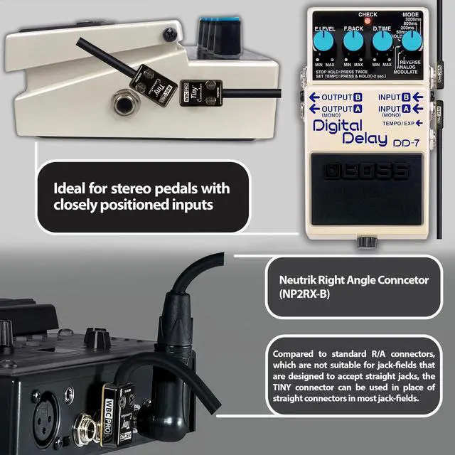 These high-value, high-quality cables will not break your bank and the integrity of your creative process. With WBC-PRO you are buying a product made with love and the utmost care for quality. WBC-PRO, the only cable you will ever need! ^^ The revolutionary Tiny Connector by Eminence, the worlds Lowest-Profile Hybrid-TS plug, combines everything good in Pancake TS, Angled TS and Straight TS plugs. Due to the extreme small size, it will negate the need to use straight TS plugs on most pedal & rack equipment. Technologically advanced finish ensures the plug retains its high-quality appearance even after decades of use.