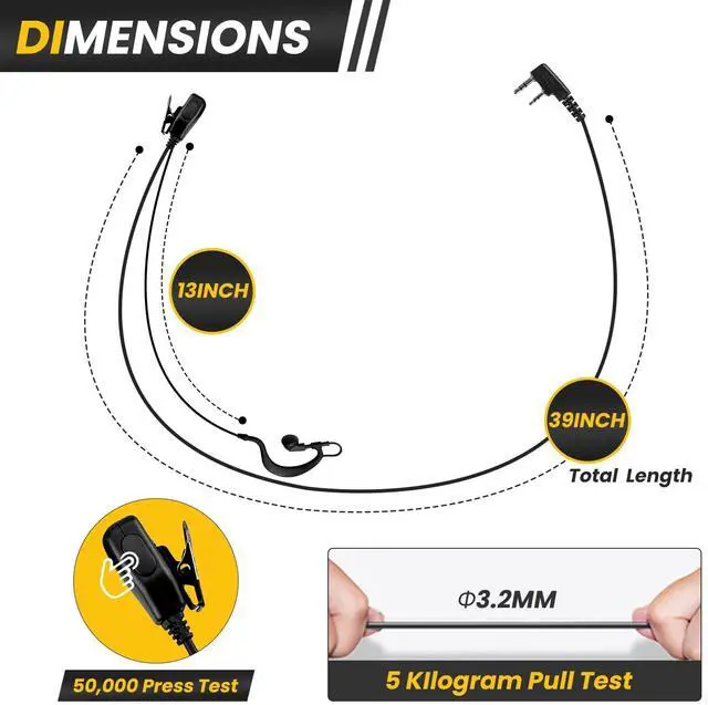 ^^ Durable Material: Made from robust cable that resists pulling, ensuring a longer lifespan. With a total length of 39 inches, from the push-to-talk button to the ear clip is 13 inches.