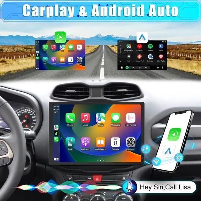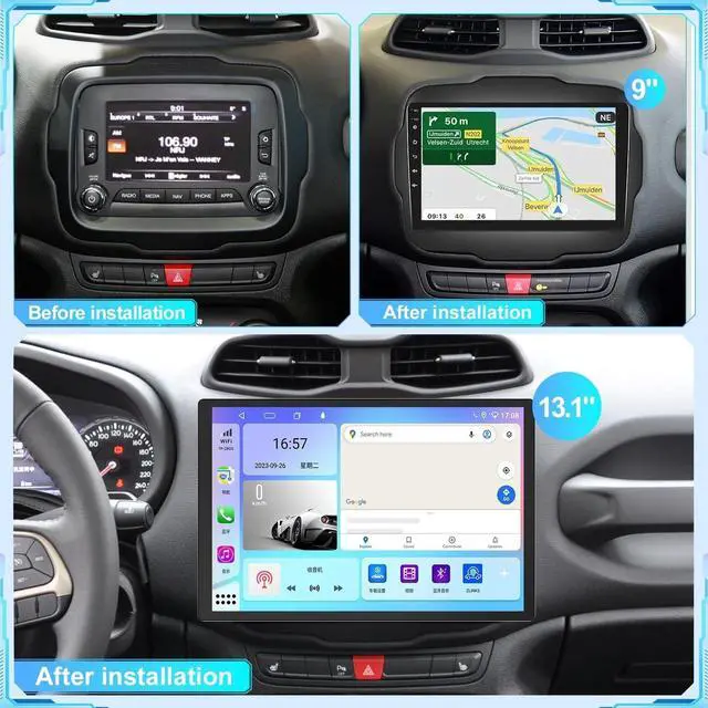 Car Radio Stereo for Jeep Renegade This car stereo radio is designed for Jeep Renegade 2015 2016 2017 2018 2019 2020. UPGRADED Android 13 operation system + 8 Core CPU + 6G RAM +128GB ROM with enhanced fluency, compatibility, and privacy. Equipped with a 13.1 -inch large screen, you can better control this machine. 100% standard size, no need to purchase additional accessories, just follow the installation instructions to make your car a new look. ^^ CarPlay & Android AutoUpgrade your drive with seamless smartphone integration! The car radio supports both Apple CarPlay & Android Auto via wired or wireless connection.