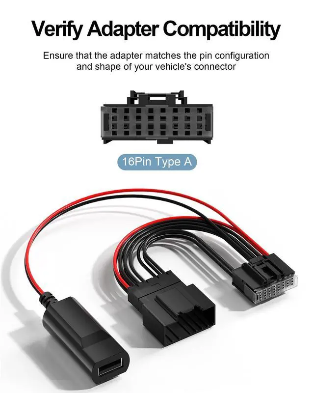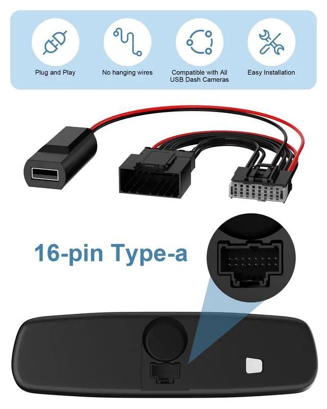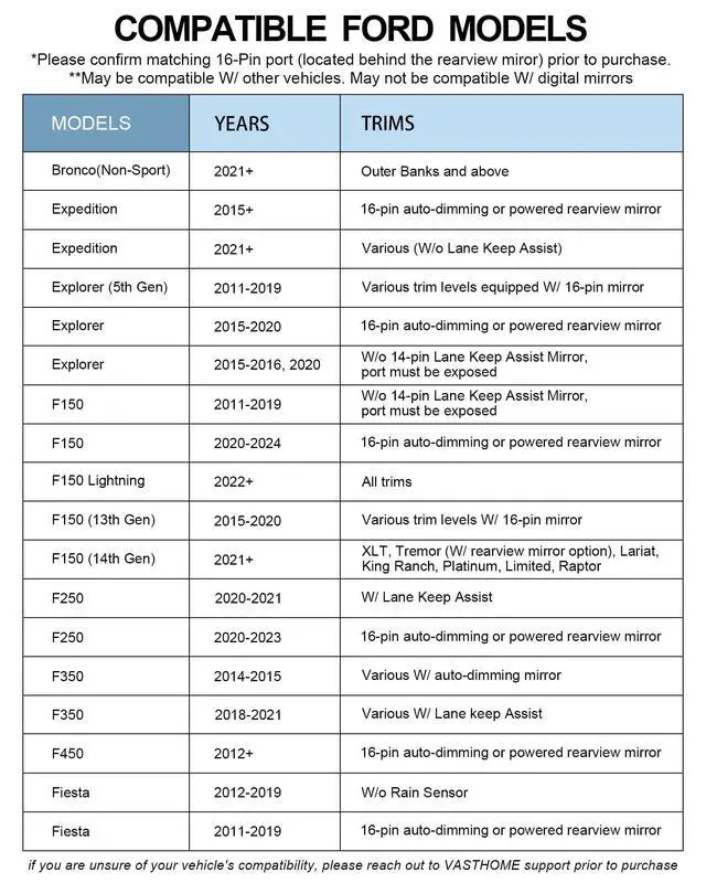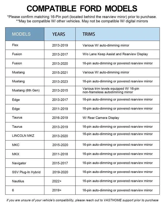 Compatibility VASTHOME dashcam power adapter (16-pin Type A) for Ford vehicles. It is compatible with Bronco, Expedition, Explorer, F150, F250, F350, F450, Fiesta, Flex, Fusion, Mustang, Edge, Taurus, and LINCOLN MKZ, MKC, MKX, Navigator, and SSV Plug-In Hybrid, Nautilus, along with other vehicles featuring a 16-pin Type A port ^^ Versatile USB CompatibilityThe 16-pin Type A dashcam power adapter is compatible with all USB-powered dashcams on the market and other USB devices, including radar detectors and GPS ^^ Vehicle Requirements The dash cam power adapter 16-pin Type A requires your vehicle to have an auto-dimming or powered rearview mirror.