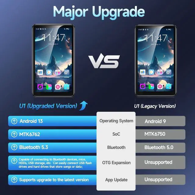 144GB Huge Storage + Expandable up to 1TBAndroid MP3 Player This Bluetooth MP3 player boasts a massive 144GB internal storage, expandable up to 1TB with a TF card, storing endless MP3/MP4/FLAC/WAV songs, videos, and e-books. Perfect for audiophiles who demand high-capacity portable music players without compromising quality. ^^ 4-Inch Touchscreen + Bluetooth 5.3 & WiFiSmart Media Player Features a 4-inch HD touchscreen for smooth navigation and supports Bluetooth 5.3 for wireless headphones/speakers. With WiFi connectivity, stream music on Spotify, Music, YouTube, and TikTok, transforming it into an all-in-one entertainment MP4 player.